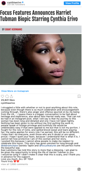 “This story has gone unnoted for long enough and @debramchaseDaniela Taplin and @focusfeatures are the perfect home the beautiful way. Kasi Lemmons has told this story is more than a blessing. I am glad to be given the opportunity to bring the life of Harriet Tubman to you. I would be lying if I didn’t make it clear that this is scary, and I thank you in advance for the support. Love you much. ALL OF YOU! Yours truly…”