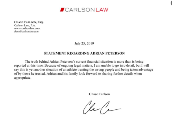 “The truth behind Adrian Peterson’s current financial situation is more than is being reported at this time. Because of the ongoing legal matters, I am unable to go into detail, but I will say this is yet another situation of an athlete trusting the wrong people and being taken advantage of by those he trusted. Adrian and his family look forward to sharing further details when appropriate.”