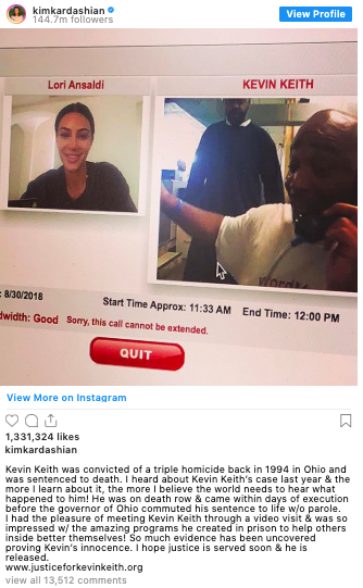She’s also on track to help prove the innocence of Kevin Keith, a man on death row after being convicted of murder in the 90s. She shared a photo of the two video chatting and wrote,