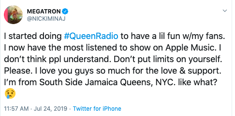 “I started doing #QueenRadio to have a lil fun w/my fans. I now have the most listened to show on Apple Music. I don’t think ppl understand. Don’t put limits on yourself. Please. I love you guys so much for the love & support. I’m from South Side Jamaica Queens, NYC. like what?”