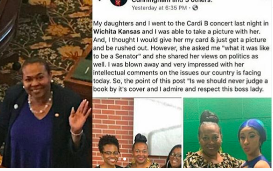 She also shared a story from a woman who came to her show in Wichita, KS and happened to be a Senator. The woman said she took her daughters to a Cardi B concert and took a picture with her. She was surprised when the rapper stopped her and asked her about her views. The woman said,