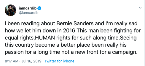 “I been reading about Bernie Sanders and I’m really sad how we let him down in 2016. This man been fighting for equal rights, HUMAN rights for such a long time. Seeing this country become a better place been really his passion for a long time not a new front for a campaign.”