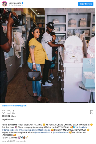 “Had a awesome FIRST WEEK OF FILMING KEYSHIA COLE IS COMING BACK TO BET!!!!! But this time She’s bringing Something SPECIAL! A BABY SPECIAL Both MY MOMMIES, HOPEFULLY Happy to be working back with u lots of Fun and LAUGHTER ? 10 DAYS AWAY!!”