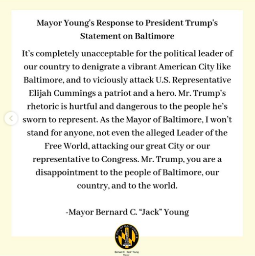 “It’s completely unacceptable for the political leader of our country to denigrate a vibrant American City like Baltimore, and so viciously attack U.S. Representative Elijah Cummings a patriot and a hero. Mr. Trump’s rhetoric is hurtful and dangerous to the people he’s sworn to represent. As the Mayor of Baltimore, I won’t stand for anyone, not even the alleged leader of the Free World, attacking our great City or our representative to Congress. Mr. Trump, you are a disappointment to the people of Baltimore, our country, and to the world.”