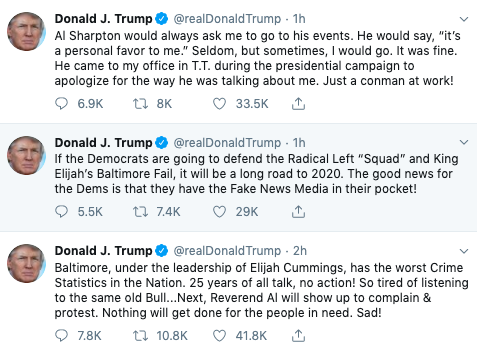 “Rep, Elijah Cummings has been a brutal bully, shouting and screaming at the great men & women of color of Border Patrol about conditions at the Southern Border, when actually his Baltimore district is FAR WORSE and more dangerous. His district is considered the Worst in the USA…”