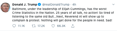“Baltimore, under the leadership of Elijah Cummings, has the worst Crime Statistics in the Nation. 25 years of all talk, no action! So tired of listening to the same old Bull…Next, Reverend Al will show up to complain & protest. Nothing will get done for the people in need. Sad!”