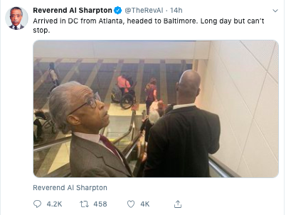It started after Sharpton posted a photo of himself heading to Baltimore after Trump blasted one of the city’s representatives, Elijah Cummings.