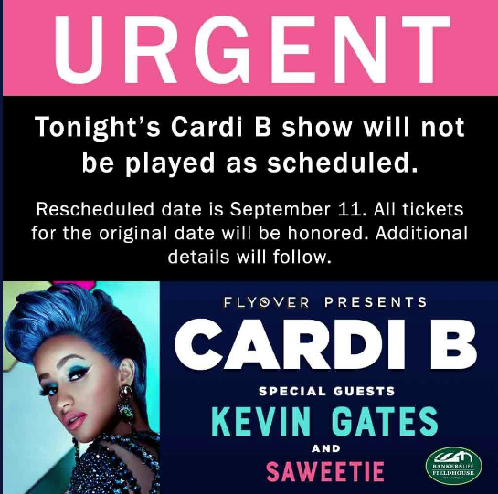 Cardi B reportedly had to cancel her concert in Indianapolis minutes before her show, due to an “unverified threat” made against her according to the Indianapolis Metropolitan Police Department. The show was scheduled to start at 7 p.m. and the postponement was announced at 6:24 p.m. There is no immediate threat to public safety, nor is there an active incident, but police are continuing to investigate.
