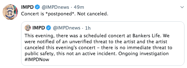 Dear Indiana people I’m so sorry for today .I will like to let you know I was at the venue I was even rehearsing a new move I been excited to do on my show. Unfortunately there was a security threat that is currently under investigation right now. My safety and your safety first. pic.twitter.com/4glELemzYY