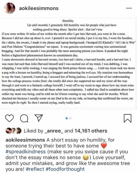 Aoki Lee Simmons has been using her voice via short essays on social media for several months now. She’s even opened up about her own personal revelations as a young woman on her way to college. Earlier this year, she shared how she learned a lesson on humility after bragging to her family about being accepted to the prestigious Harvard College.