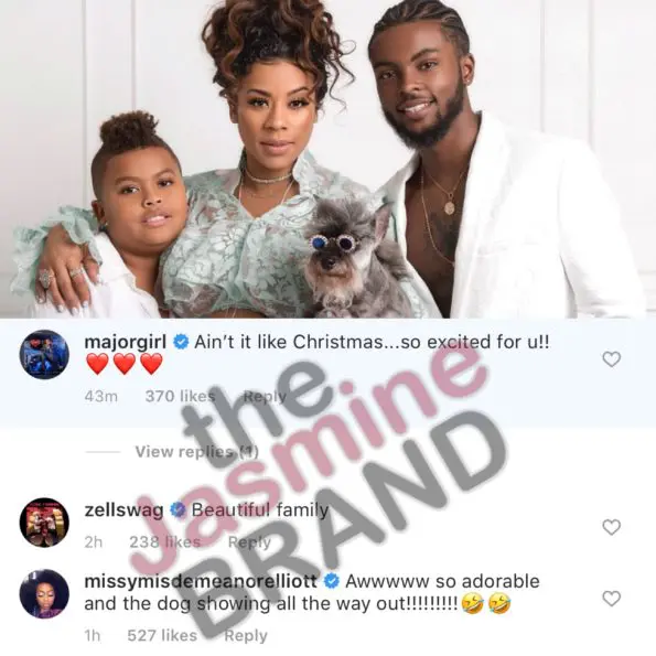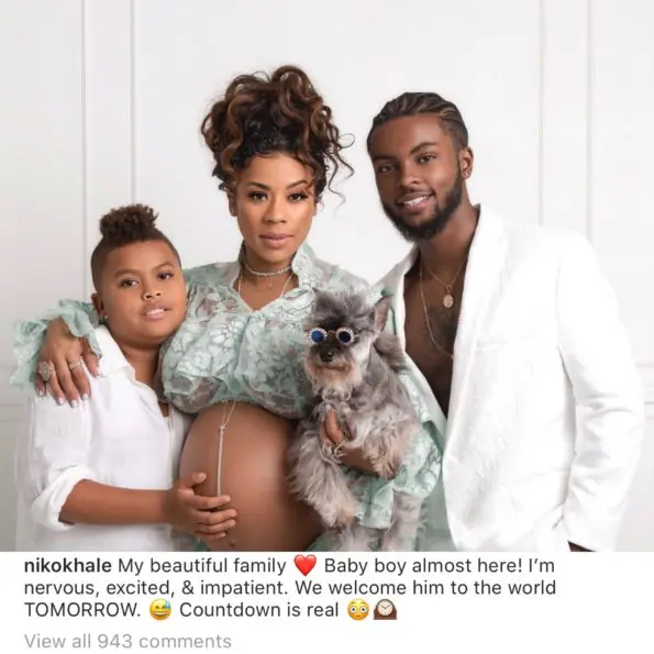 Singer Keyshia Cole looks ready to pop as the soon-to-be mother of two shares a new maternity photo. The singer is preparing to welcome the newest member of their family as she poses with boyfriend, Niko Hale along with Keyshia’s first born son, Daniel Gibson, Jr. The real star of the photo is Keyshia’s super adorable puppy, Lola as she rocked her puppy shades. Keyshia writes,