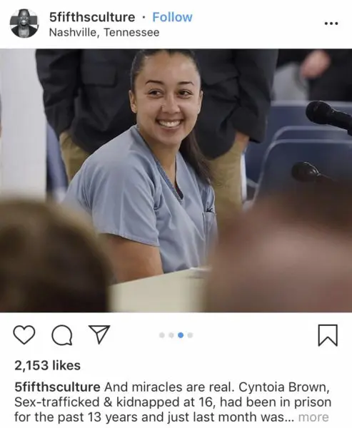 She’s a survivor! Cyntoia Brown is a 31-year-old Tennessee woman who has been incarcerated since the young age of 16. Forced into prostitution, the child sex trafficking victim was picked up by a stranger at a fast food restaurant, and coerced into performing sex acts. According to her legal team, Cyntoia shot the man out of fear that he was reaching for a gun to kill her.