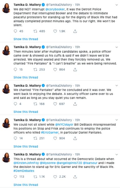 “We did NOT interrupt @corybooker, it was the Detroit Police Department that interrupted Booker and the debate to intimidate peaceful protesters for standing up for the dignity of Black life that had already completed protest minutes ago. This is our right. We won’t be silent.”