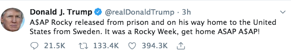 “A$AP Rocky released from prison and on his way home to the United States from Sweden. It was a Rocky Week, get home ASAP A$AP!”