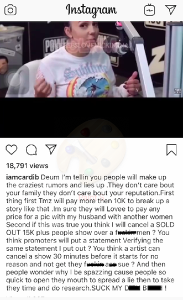 She went off on Instagram and denied rumors that she was shown photos of Offset and a mystery woman before she was supposed to hit the stage in Indianapolis this week. The snapshots haven’t been published yet, but according to reports the agency that took them is trying to sell them to a publication for more than $10,000.