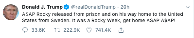 President Donald Trump also gave A$AP Rocky a shout out after Trump pushed for A$AP Rocky’s release during his days behind bars.
