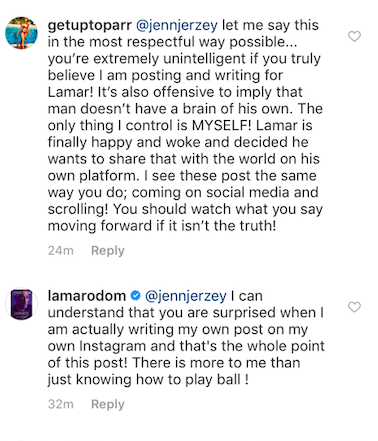 “Let me say this in the most respectful way possible… you’re extremely unintelligent if you truly believe I am posting and writing for Lamar! It’s also offensive to imply that man doesn’t have a brain of his own. The only thing I control is MYSELF! Lamar is finally happy and woke and decided he wants to share that with the world on his own platform. I see these post the same way you do; coming on social media and scrolling! You should watch what you say moving forward if it isn’t the truth!”