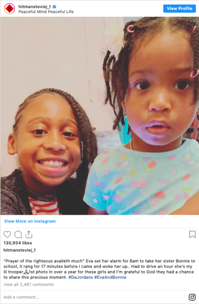 “Prayer of the righteous availeth much” Eva set her alarm for 6am to take her sister Bonnie to school, it rang for 17 minutes before I came and woke her up.. Had to drive an hour she’s my lil trooper 1st photo in over a year for these girls and I’m grateful to God they had a chance to share this precious moment. #DaJordans #EvaAndBonnie“