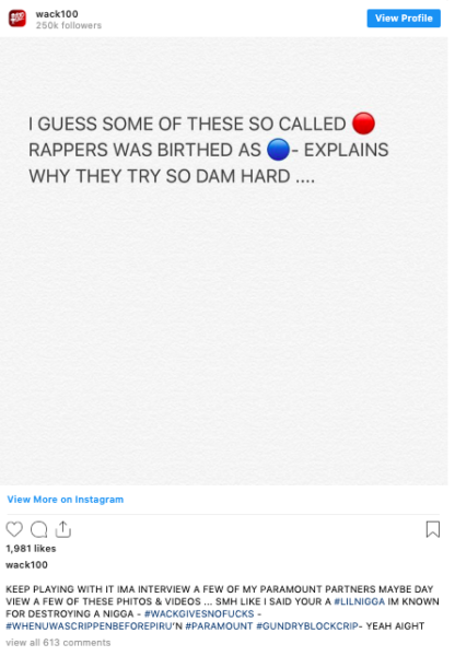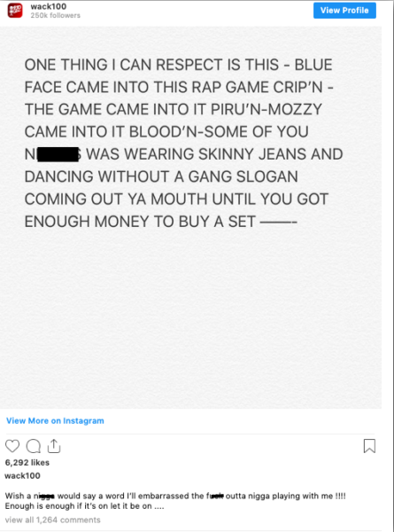 It started when Wack 100 posted a message about respecting rappers who have represented their gang affiliations.