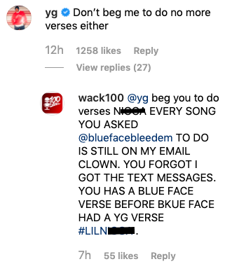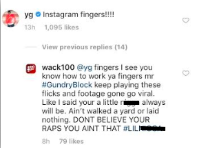 It looks like YG took it personally and responded and told Wack 100 he should have mentioned him by name, causing Wack 100 to go off even more.