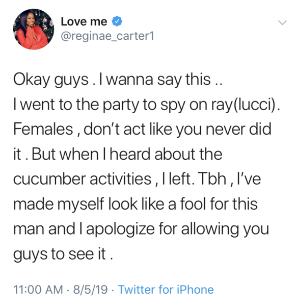 “Okay guys . I wanna say this .. I went to the party to spy on ray(lucci). Females , don’t act like you never did it . But when I heard about the cucumber activities , I lfet. Tbh , I’ve made myself look like a fool for this man and I apologize for allowing you guys to see it .”