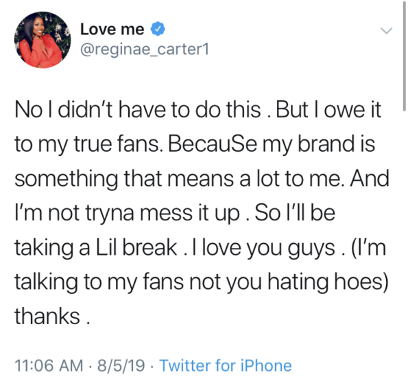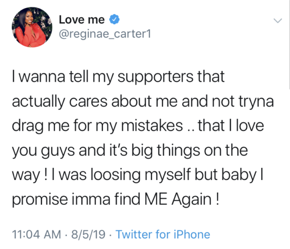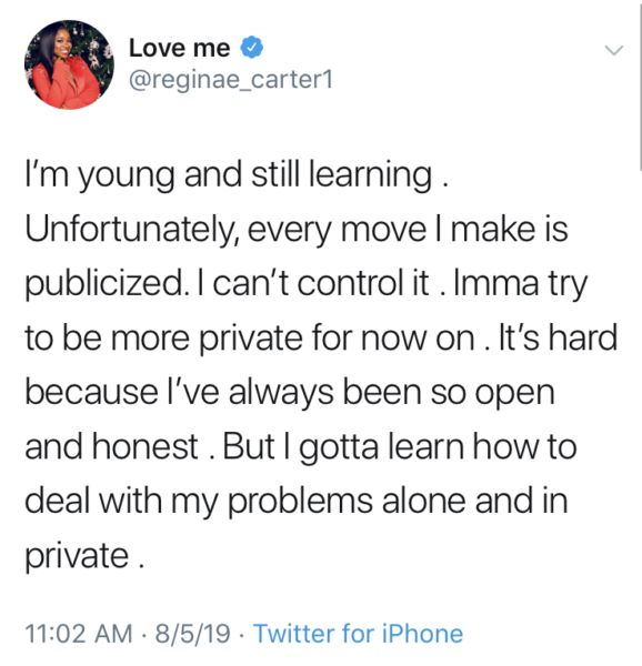 Reginae took to Twitter to acknowledge that insecurities within her relationship led her to follow him to that party, and she didn’t like what she saw. She apologized to fans for allowing her to see it unfold. She tweeted: