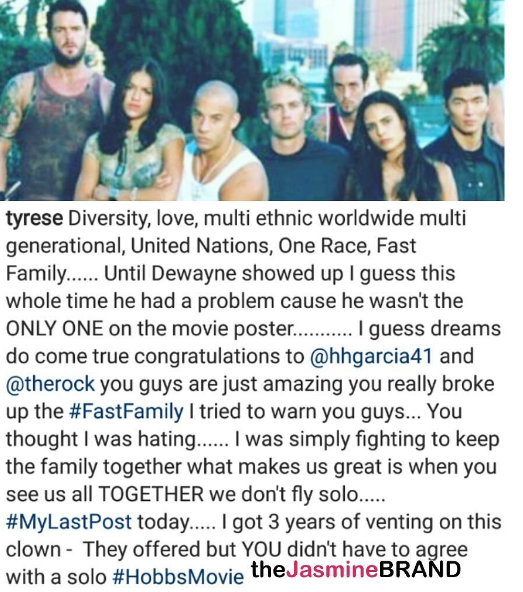 “I have to show my respects for one thing…. He tried…….. Folks called me a hater…. Attacked me for speaking out…..Breaking up the family clearly doesn’t have the value that one would assume it does. You know what maybe just maybe… The Rock and the crew will come dance with us again for #Fast10 we can all hug it out and get back to giving the true fans who have supported this franchise for 20 years WHAT they want……..No hating I’m just pointing out the facts. #FastFamily has more value as the #FastFamily its ok.”