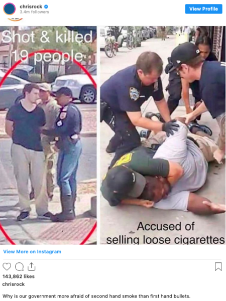 Rock also took a more serious stance and pointed out the death of Eric Garner, who was accused of selling cigarettes, and how police treated the suspect accused of killing more than 20 people in an El Paso, TX Walmart Saturday.