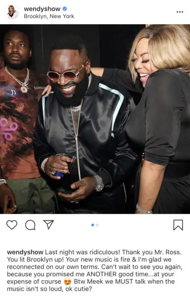 “Last night was ridiculous! Thank you Mr. Ross. You lit Brooklyn up! Your new music is fire & I’m glad we reconnected on our own terms. Can’t wait to see you again, because you promised me ANOTHER good time…at your expense of course Btw Meek we MUST talk when the music isn’t so loud, ok cutie?”