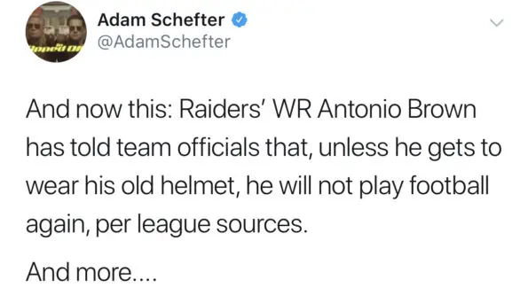 Antonio Brown has reportedly informed his team, the Oakland Raiders he will not play football again unless he can wear his old helmet. Sources say,