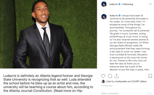 “@ludacris I always have been & continue to be extremely fortunate in my career. As I look back, Even I’m amazed at some of the things I’ve accomplished. Throughout my journey, I’ve constantly set & achieved life goals in music, business, acting, philanthropy & much more. In doing so I’ve also received several awards & my fair share of recognition. So When Georgia State officials made the announcement that they were forming a law class to cover my career I was truly humbled & honored. Education is paramount so this truly hits home for me. Thanks to Mo Ivory who will lead the class & thank you to everyone that was a part of the decision to put the class in place. How can I enroll!? I want to learn more about myself as well. #love #history”