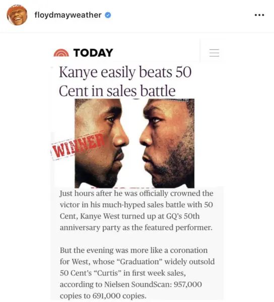 In the latest battle between the two frienemies, undefeated lightweight boxing champion, Floyd “Money” Mayweather launched a bomb on Instagram over the weekend, going after rapper/entrepreneur, Curtis “50 Cent” Jackson. In Floyd’s post, the boxer threw a few stiff jabs were it hurts, right in 50’s pockets. In detail, Floyd begins his by comparing how many times 50 was shot in 2000, to how he lost his rap career.