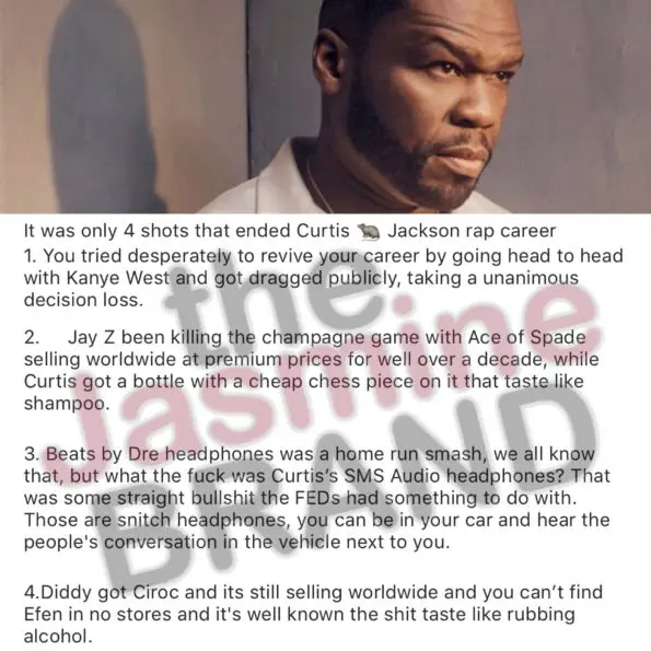“2. Jay Z been killing the champagne game with Ace of Spade selling worldwide at premium prices for well over a decade, while Curtis got a bottle with a cheap chess piece on it that taste like shampoo.”
