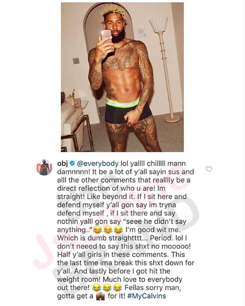 Odell Beckham, Jr. is saying it again for the people in the back. He shut down speculation once again that he’s attracted to men. The NFL star responded to fans calling him “sus” and other comments under a photo he posted of him in his boxers Monday.