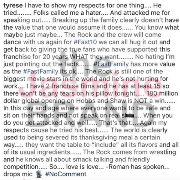 Tyrese, who has been a part of the Fast & Furious franchise since the second film, made it clear from the beginning he wasn’t a fan of The Rock landing a spinoff. Hobbs & Shaw made $180 million its first weekend, and Tyrese said that that’s not a win. He posted and deleted the message below.