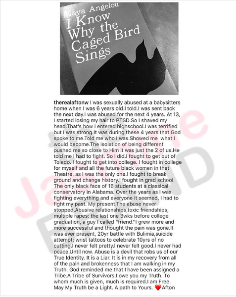 She wrote posted a photo of Maya Angelou’s “I Know Why The Caged Bird Sings” book and wrote,