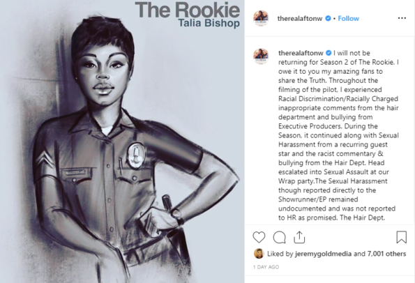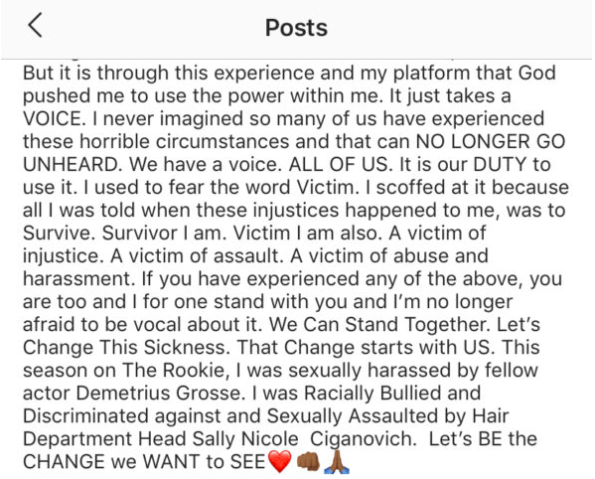 Williamson’s heartfelt message comes just days after she claimed her fellow The Rookie actor Demetrius Grosse and head of the Hair Department, Sally Nicole Ciganovich for sexually abusing her. She added that executive producers also bullied her as well.
