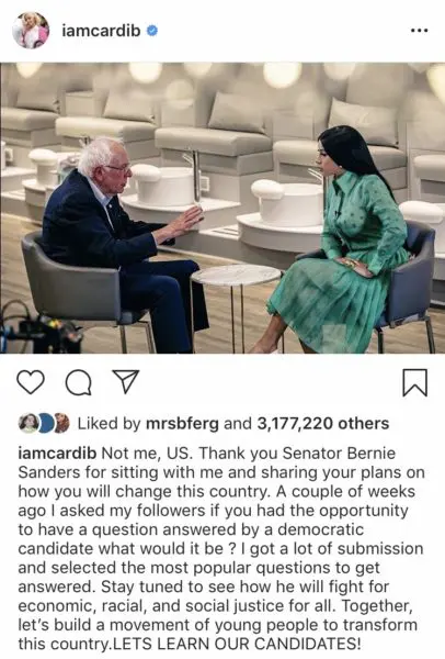 Cardi is encouraging her followers to get to know the candidates, their history, and their plans for the future in order to make an impactful vote. Weeks ago, she sat down with Presidential candidate Bernie Sanders to discuss Americans’ concerns in a relatable way.