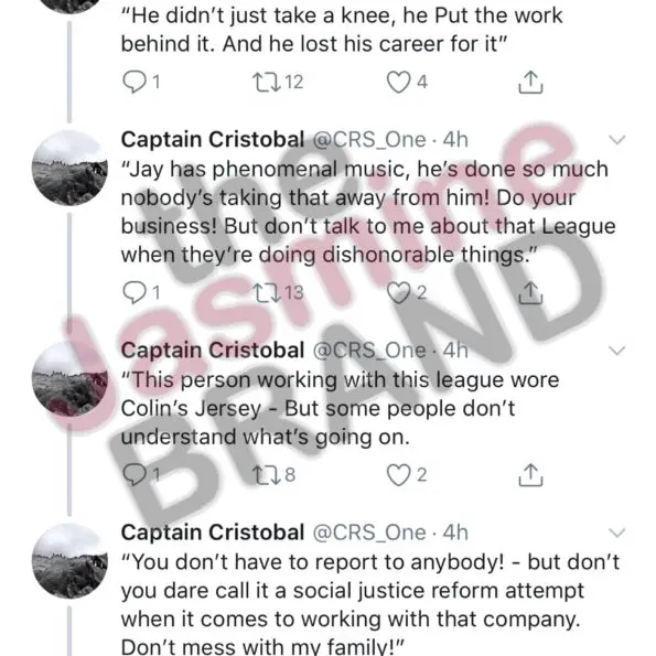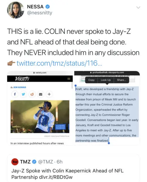 “THIS is a lie. COLIN never spoke to Jay-Z and NFL ahead of that deal being done. They NEVER included him in any discussion.”