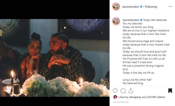 His longtime girlfriend, actress Lauren London, saluted him in an emotional Instagram letter to her son’s father.