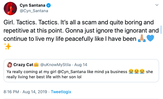 “Girl. Tactics. Tactics. It’s all a scam and quite boring and repetitive at this point. Gonna just ignore the ignorant and continue to live my life peacefully like I have been”