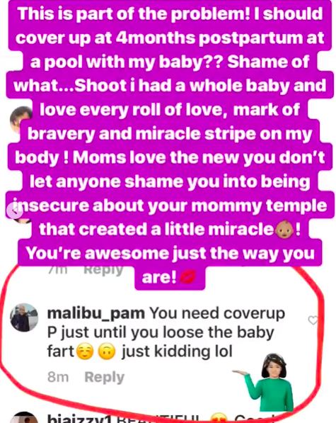 “This part of the problem! I should cover up at 4 months pospartum at a pool with my baby?? Shame of what… Shoot i had a whole baby and love every roll of love, mark of bravery and miracle stripe on my body! Moms love the new you don’t let anyone shame you into being insecure about your mommy temple that created a little miracle! You’re awesome just the way you!”