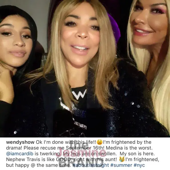 How she doing? Daytime talk host, Wendy Williams, 55, had another eventful New York City night out with some of her girlfriends, including reality tv personality from ‘Growing Up Hip-Hop,’ Madina Milana and Grammy award winning rapper, Cardi B. During their girls night out at the Bryant Park Hotel on Saturday night, Wendy shares a selfie of the ladies. Wendy begins,