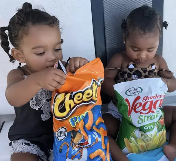 The pictures catches the tots lounging on a beach chair next to one another as they attempted to drink from cups of water and snack on Cheetos and Veggie Straws.