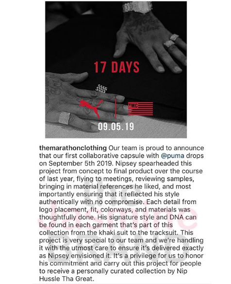 Our team is proud to announce that our first collaborative capsule with @puma drops on September 5th 2019. Nipsey spearheaded this project from concept to final product over the course of last year, flying to meetings, reviewing samples, bringing in material references he liked, and most importantly ensuring that it reflected his style authentically with no compromise. Each detail from logo placement, fit, colorways, and materials was thoughtfully done. His signature style and DNA can be found in each garment that’s part of this collection from the khaki suit to the tracksuit. This project is very special to our team and we’re handling it with the utmost care to ensure it’s delivered exactly as Nipsey envisioned it. It’s a privilege for us to honor his commitment and carry out this project for people to receive a personally curated collection by Nip Hussle Tha Great.