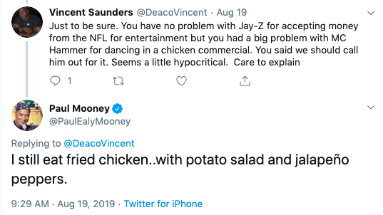 Mooney was on a role and also responded to a fan who called him a hypocrite for once calling out MC Hammer for dancing for chicken in a vintage KFC commercial.
