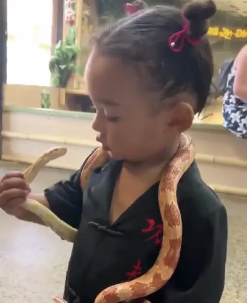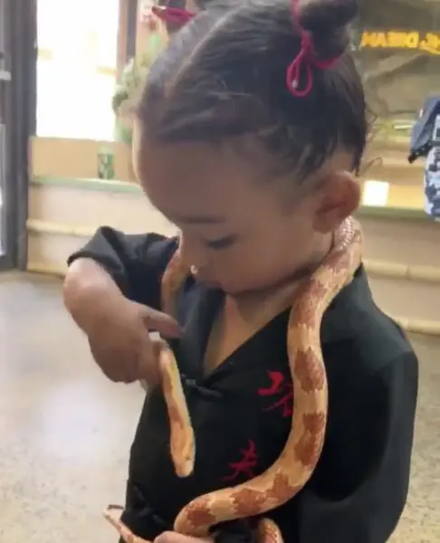 The adorable pig-tail wearing one-year-old comfortably held the slithering orange snake around her neck, maneuvering its body like a boss!