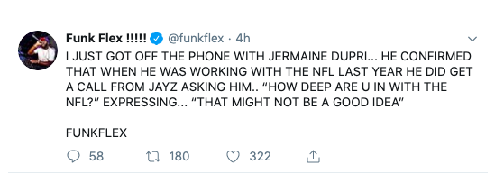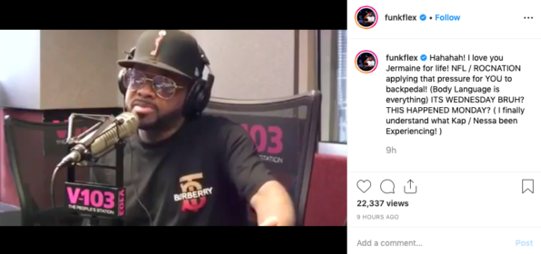 “Hahahah! I love you Jermaine for life! NFL / ROCNATION applying that pressure for YOU to backpedal! (Body Language is everything) ITS WEDNESDAY BRUH? THIS HAPPENED MONDAY? ( I finally understand what Kap / Nessa been Experiencing! )”