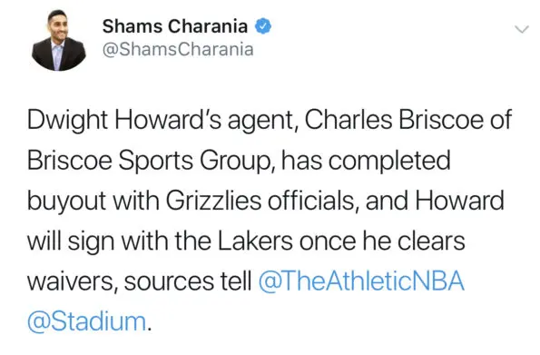 On Friday, Howard’s agent, Charles Briscoe told NBA insider, Shams Charania the 8-time NBA All Star would complete a buyout with the Grizzlies and will sign with the Lakers once he clears waivers.