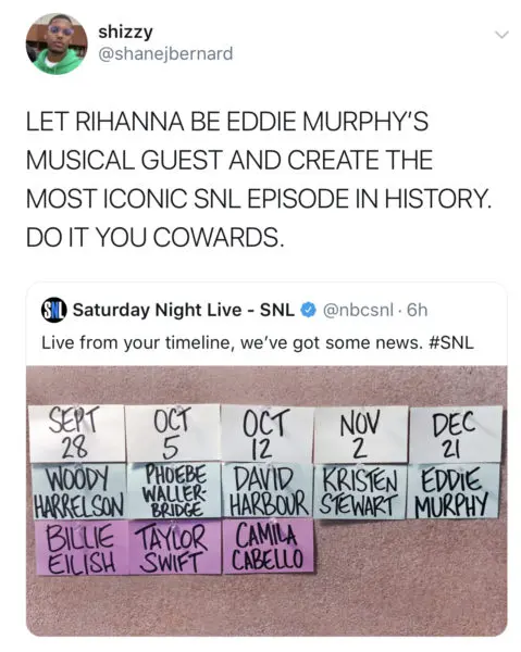 As the news of Murphy’s return to the SNL stage, social media reacted. One fan took to Twitter to give a suggestion on who should be Murphy’s musical guest.